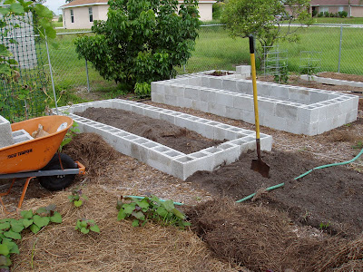 And now onto the project. I decided to rebuild several of my beds which had boards that were beginning to rot. I decided to use an idea I got from Gardening Revolution and construct the beds with concrete blocks. I ordered everything from Lowe's and they delivered it Friday. Today I began rebuilding the beds and will fill them with my own soil mix instead of mixing it with the dirt from native ground. I haven't filled them yet but will work on that tomorrow.
